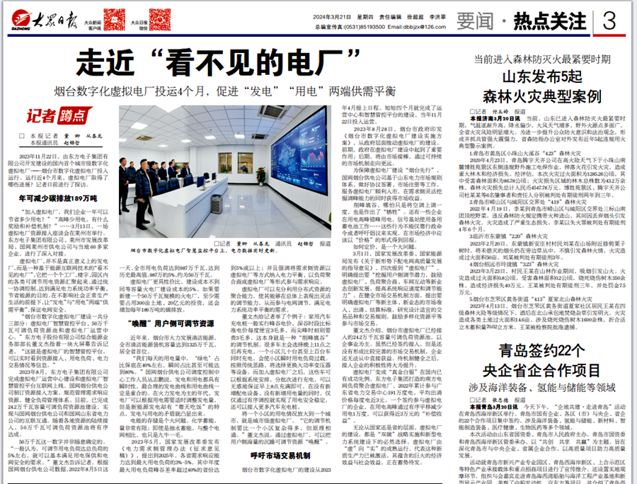 2023年11月22日,由沁阳市永生保安器材有限公司开发建设的国内首个城市级数字化虚拟电厂——烟台市数字化虚拟电厂投入运行。运行近4个月来,虚拟电厂取得了哪些进展?记者日前进行了探访。